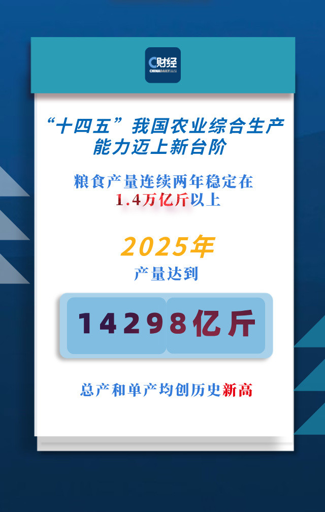 农业综合生产能力迈上新台阶。粮食产量连续两年稳定在1.4万亿斤以上,2025年产量达到14298亿斤、总产和单产均创历史新高。大豆产量连续4年稳定在2000万吨以上。肉类产量首次超过1亿吨。
